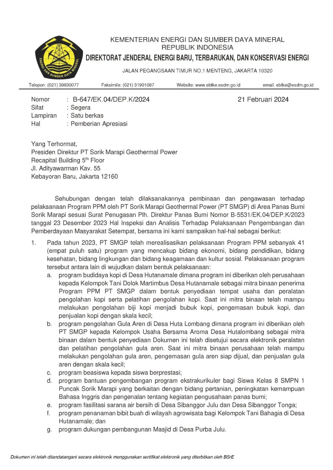 今天上午,開(kāi)山集團(tuán)投資在蘇門(mén)答臘Mandailing Natal縣的地?zé)犴?xiàng)目公司PT SMGP收到一份來(lái)自印尼能礦部可再生和新能源總局(EBTKE)地?zé)崽庨L(zhǎng)Pak Harris簽署的“致PT SMGP的感謝信”,該信函的主旨是對(duì)SMGP公司 CDCR 團(tuán)隊(duì)為 Sorik Marapi-Roburan 工作區(qū)的社區(qū)發(fā)展計(jì)劃所做的巨大努力表示感謝。SMGP實(shí)施的社區(qū)發(fā)展計(jì)劃和援助表明,除了為SMGP運(yùn)營(yíng)所在地的社區(qū)持續(xù)提供地?zé)衢_(kāi)發(fā)所產(chǎn)生的電能外,公司還致力于提供其他福利。