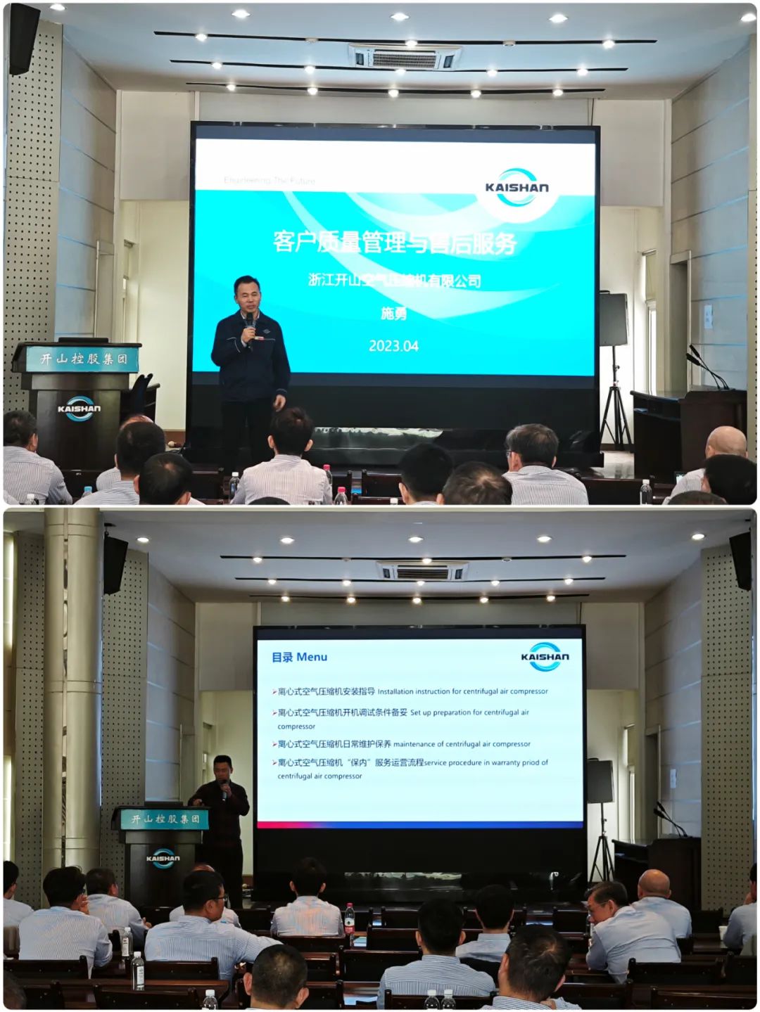 浙江開山壓縮機有限公司質量總監(jiān)施勇做了開山傳統(tǒng)螺桿產品海外市場的支持流程和質量提升流程匯報,開山服務(上海)有限公司總經(jīng)理楊轍做了離心機、PET等產品海外市場服務管理及服務培訓。